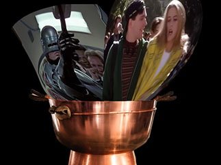 Notice the yellow jacket from Cher and the gray sci-fi outfit on the guy. He doesn't look anything like Robocop, but other image clues would feature other aspects of the movies